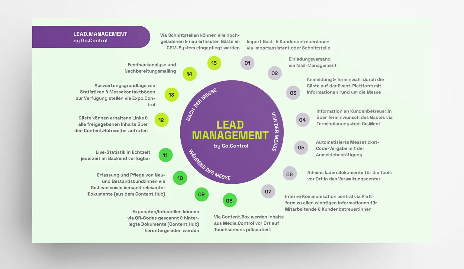Unser Lead.Management dient der ganzheitlichen Kommunikation eines Unternehmens vor, während und nach einem Messeauftritt. Es begleitet den gesamten Prozess – von einer möglichen Einladung über die Lead-Erfassung und Pflege bis hin zu Admin-Tools mit Live-Statistiken und Exportfunktionen. Das Media-Management vor Ort sowie der Raum- und Terminassistent unterstützen den professionellen und strukturierten Auftritt des Unternehmens. Nach der Messe kann es direkt in die Nachbearbeitung gehen mit Hilfe von Statistiken, Exporten, Feedbackanalysen und mehr.